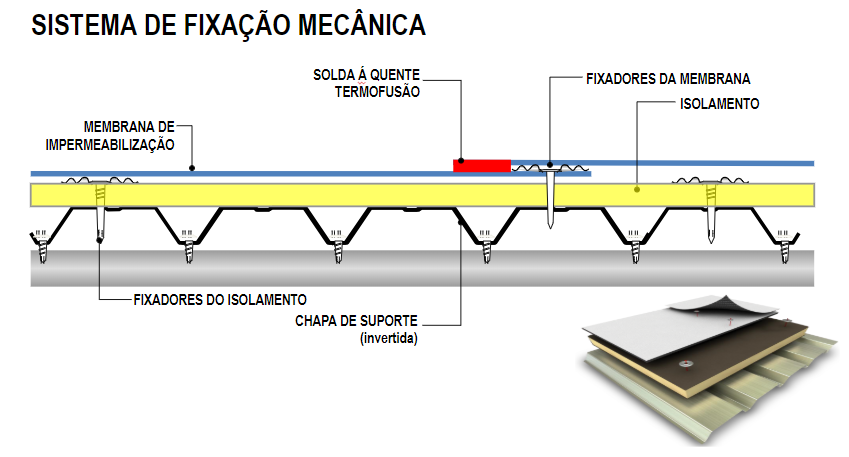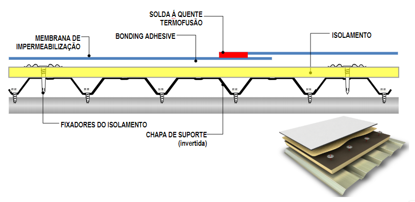 O sistema é composto por uma chapa metálica de suporte, que varia de 0,7 mm a 1,00 mm de espessura, uma placa de isolamento que pode ser uma lã de rocha de alta densidade ou placas de PIR (polyisocyanurate), que garante o bom desempenho da cobertura quer em termos térmicos, quer em termos acústicos, e finalmente, para garantir a estanqueidade do sistema, é aplicada uma membrana que poderá ser sintética ou betuminosa.