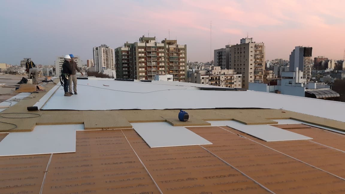 Type of work: Acoustic covering system (system with 17 layers), finished with TPO membrane Location: Buenos Aires - Argentina Area: 14,200 m² Execution time: 03 months Year: 2019
